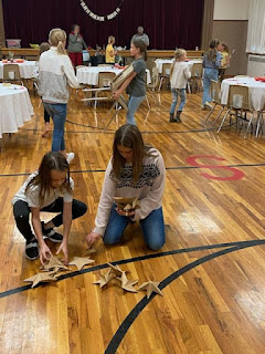 3. Hang banners and stars: Welcome on south west corner with table/tablecloth. Water hole in front of stage. Daughter-Daddy Hoe-Down on photoshoot or east wall above music table. Stars around as needed